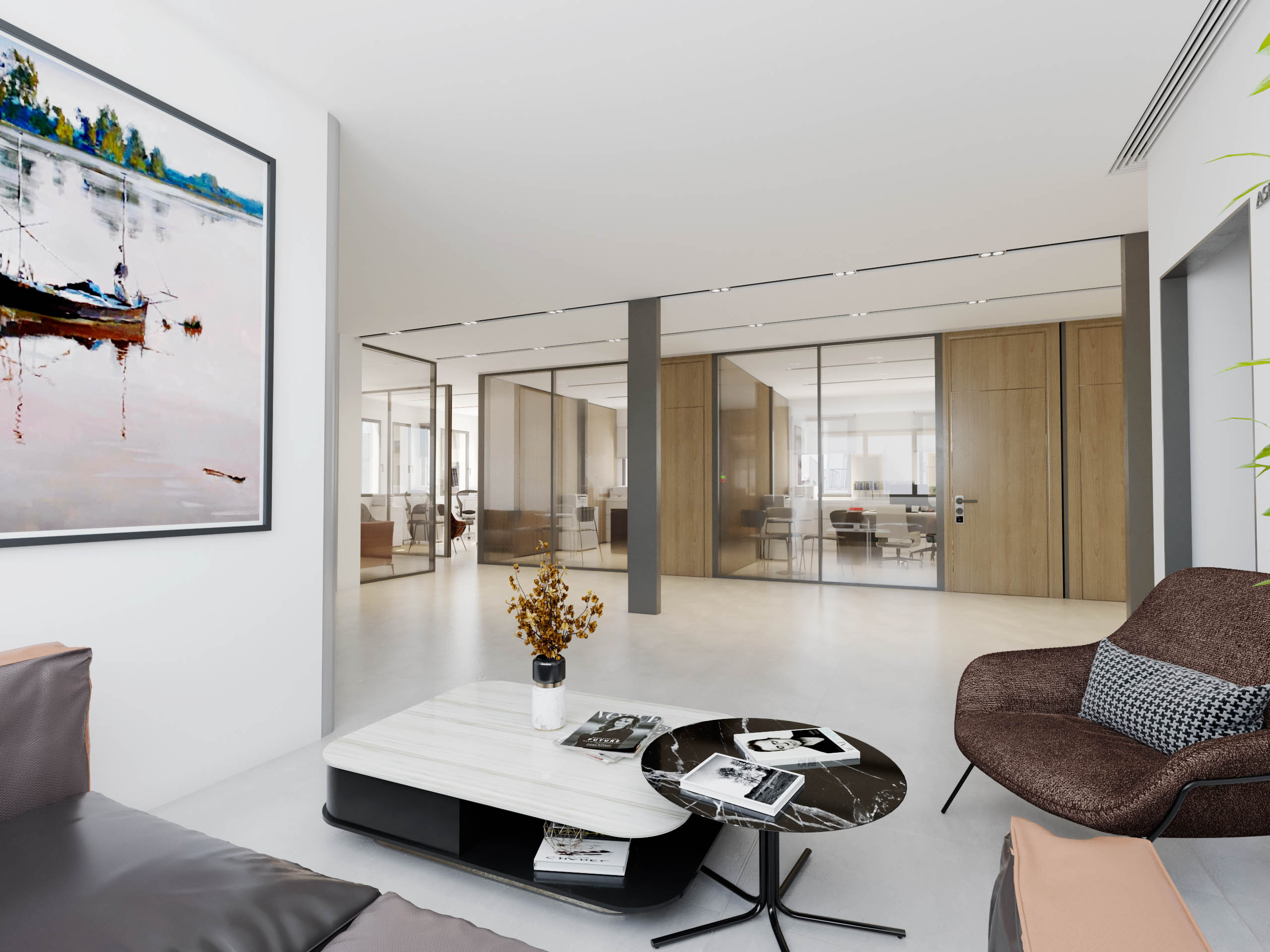 Los despachos están configurados según los requisitos del programa, incluyendo un escritorio con sillas de atención al público, mobiliario de oficina y una pequeña zona para reuniones informales.