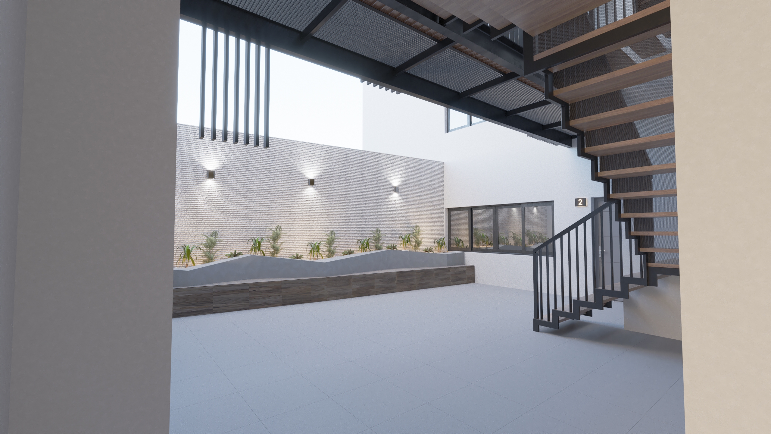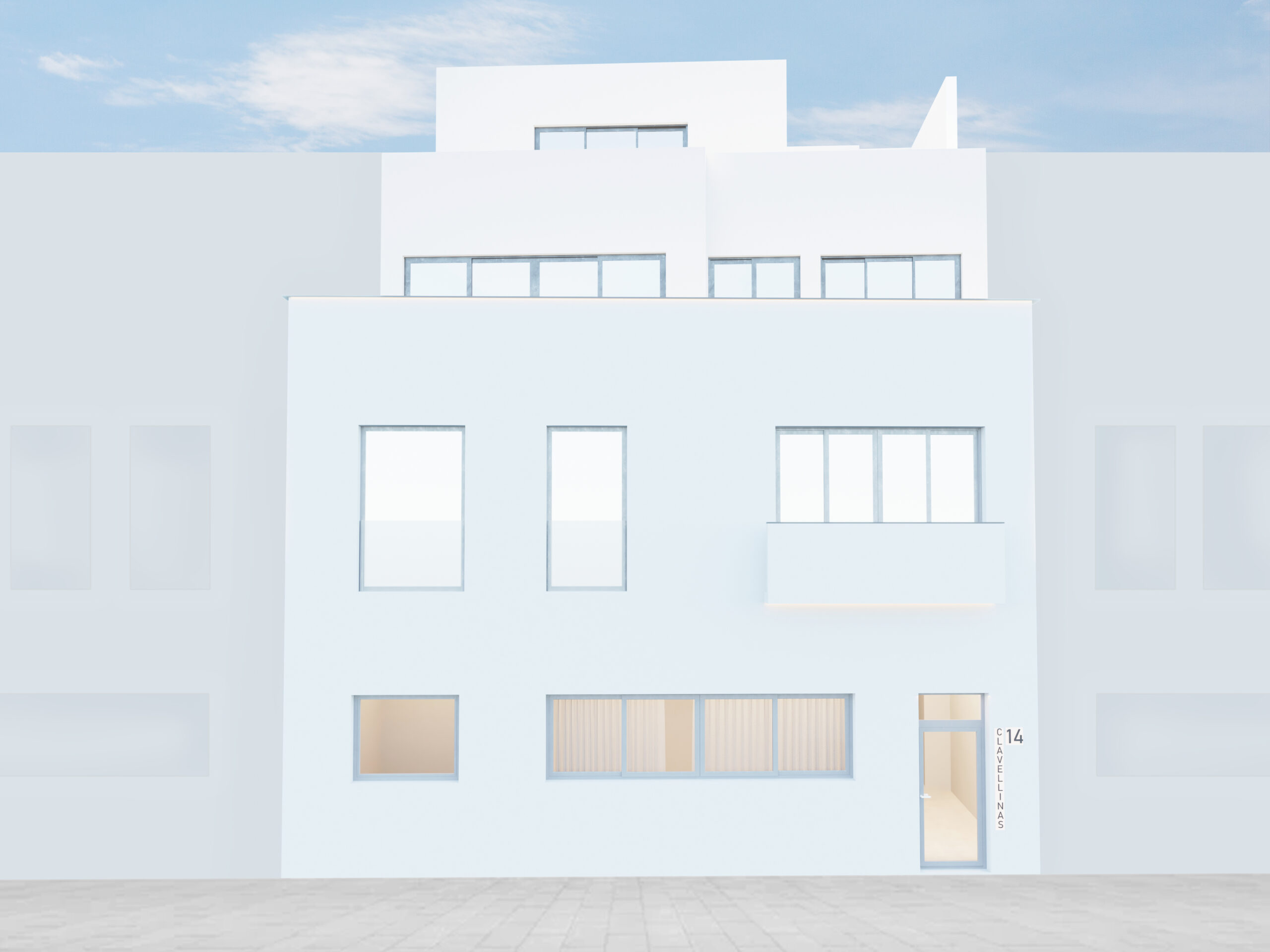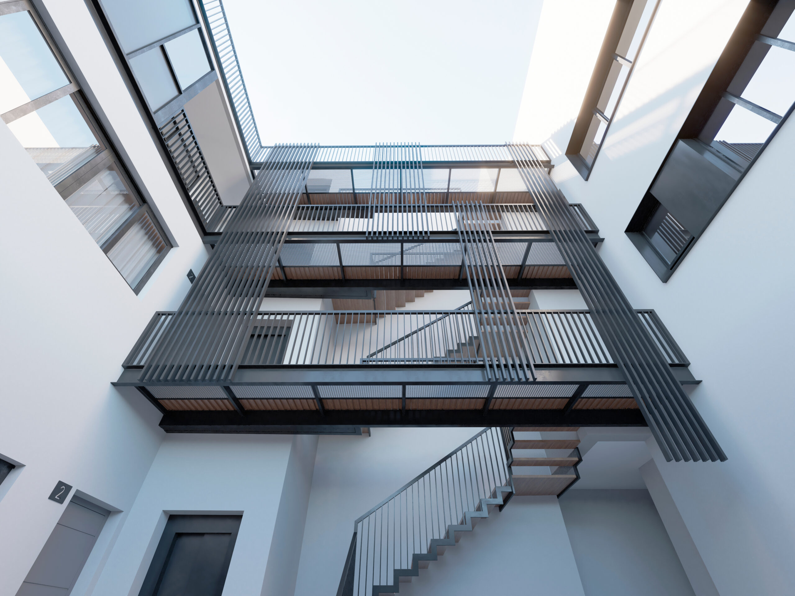 Dado que la parcela presenta dimensiones reducidas y medianeras irregulares, se ha priorizado una arquitectura permeable, con galerías y escaleras ligeras que minimizan la ocupación de las zonas comunes.
