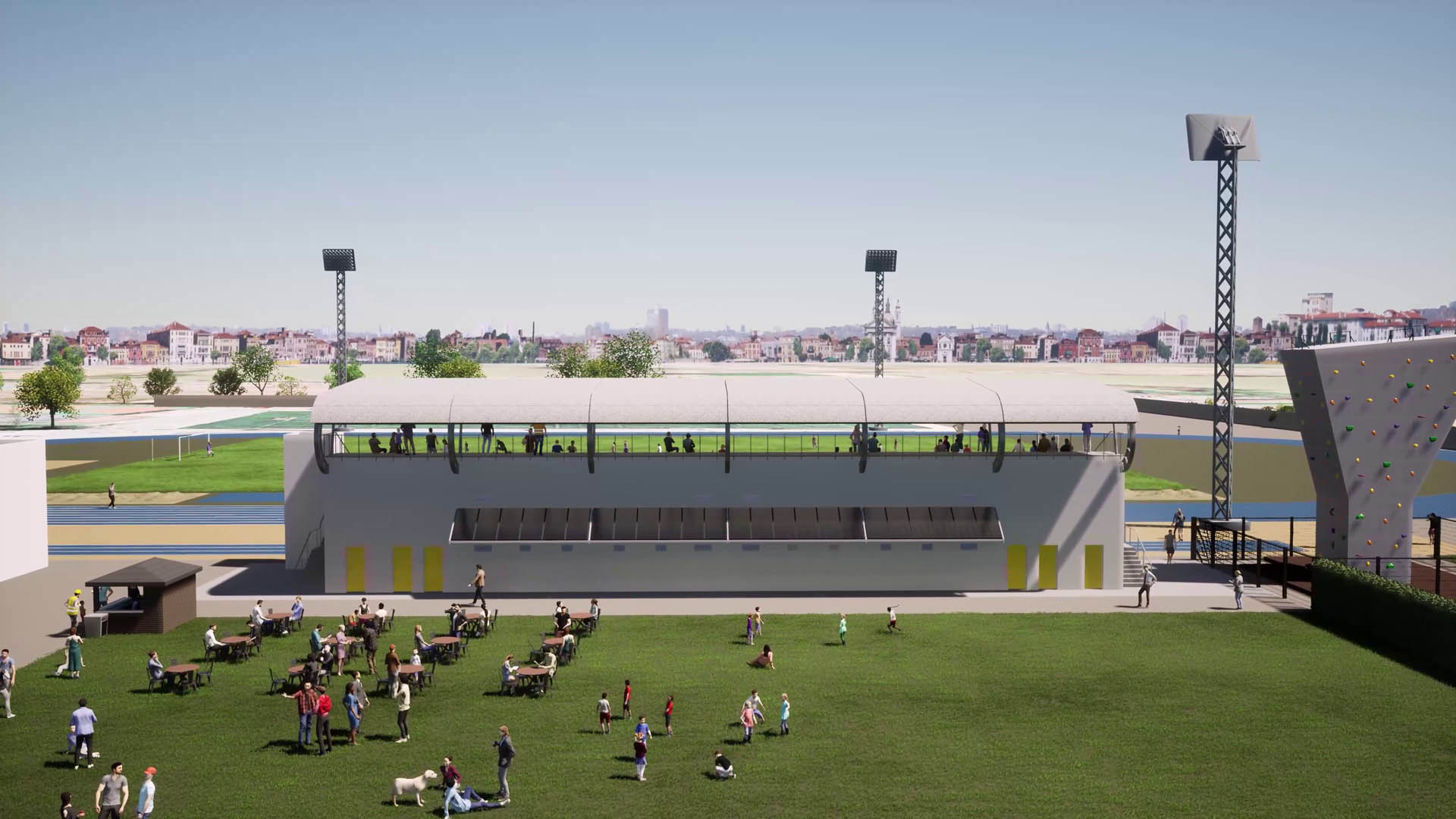 Además, el proyecto incorpora zonas complementarias que amplían las posibilidades de uso del espacio, incluyendo áreas para actividades al aire libre, una zona de rocódromo y un espacio de restauración. Estas incorporaciones refuerzan el carácter multifuncional del polideportivo, promoviendo el deporte y la convivencia social.