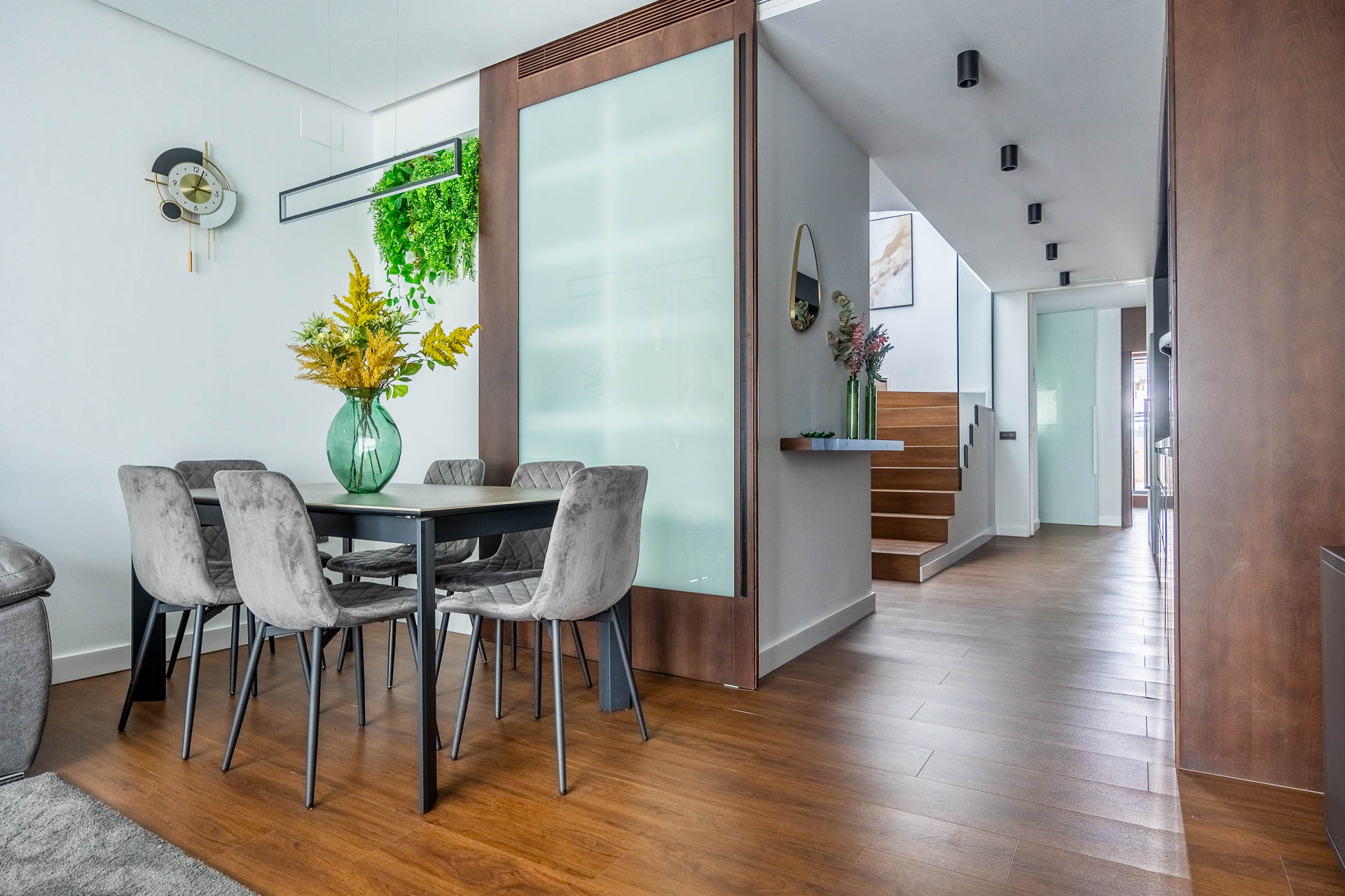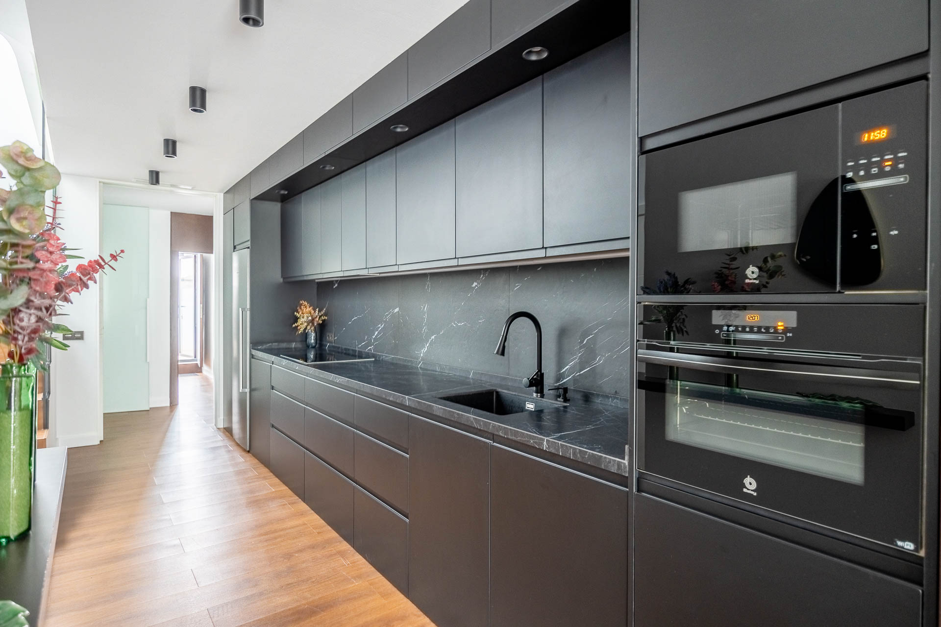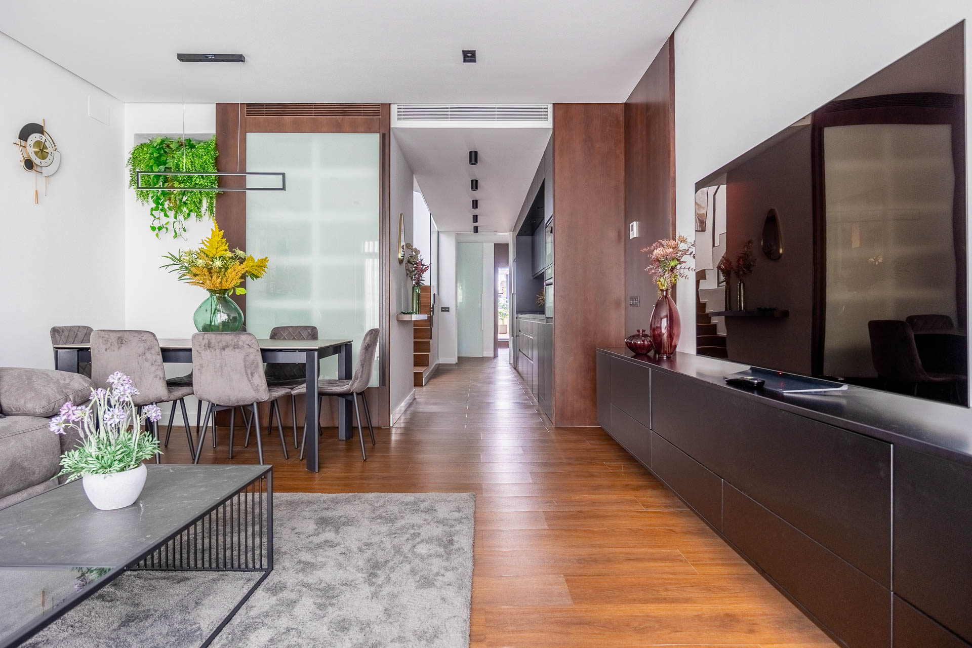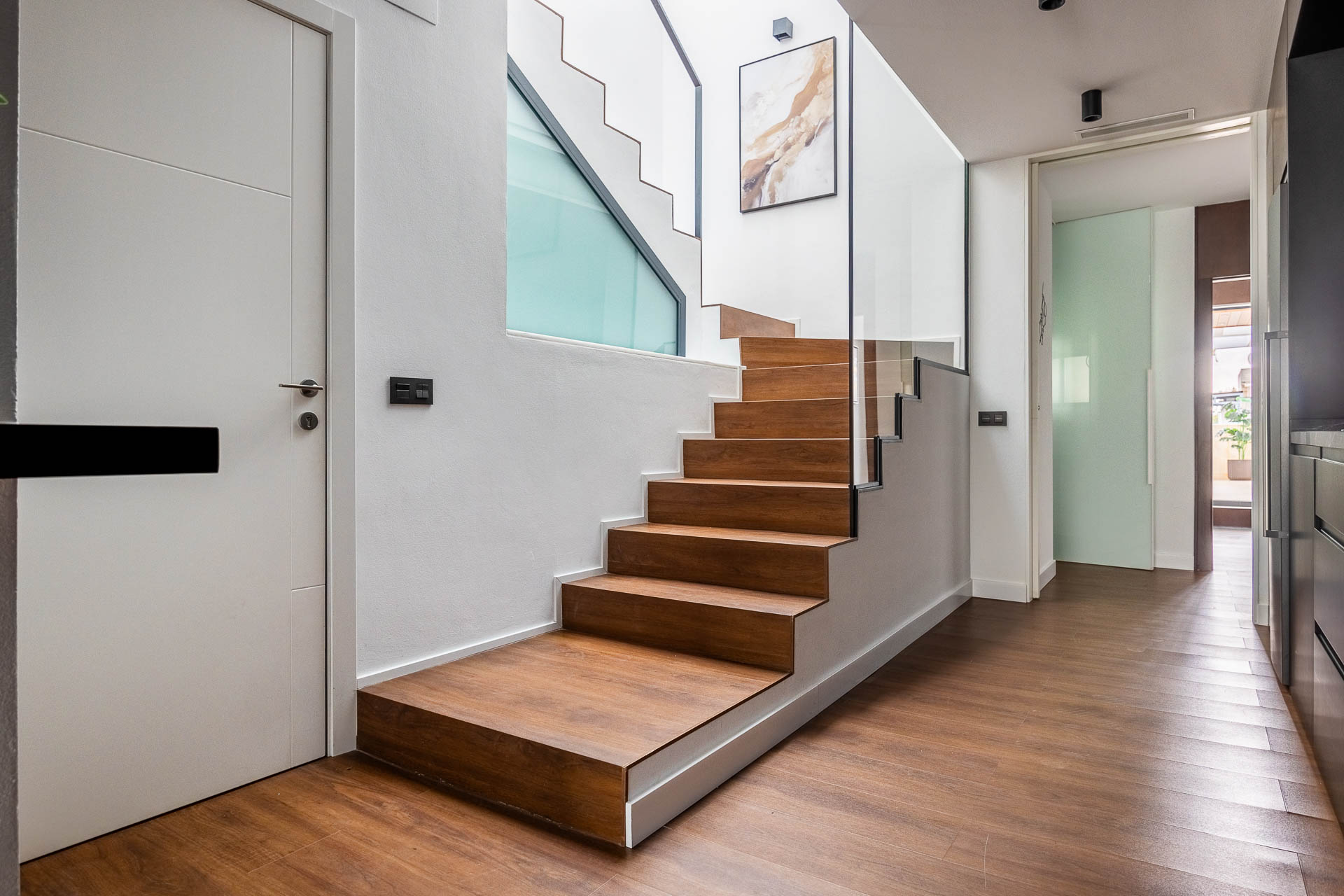 La elección de materiales y acabados responde a criterios de calidad y confort, logrando interiores cálidos y sofisticados. En la fachada, el proyecto sigue una estética moderna y racionalista, maximizando la entrada de luz natural y asegurando una imagen armónica dentro del entorno urbano.