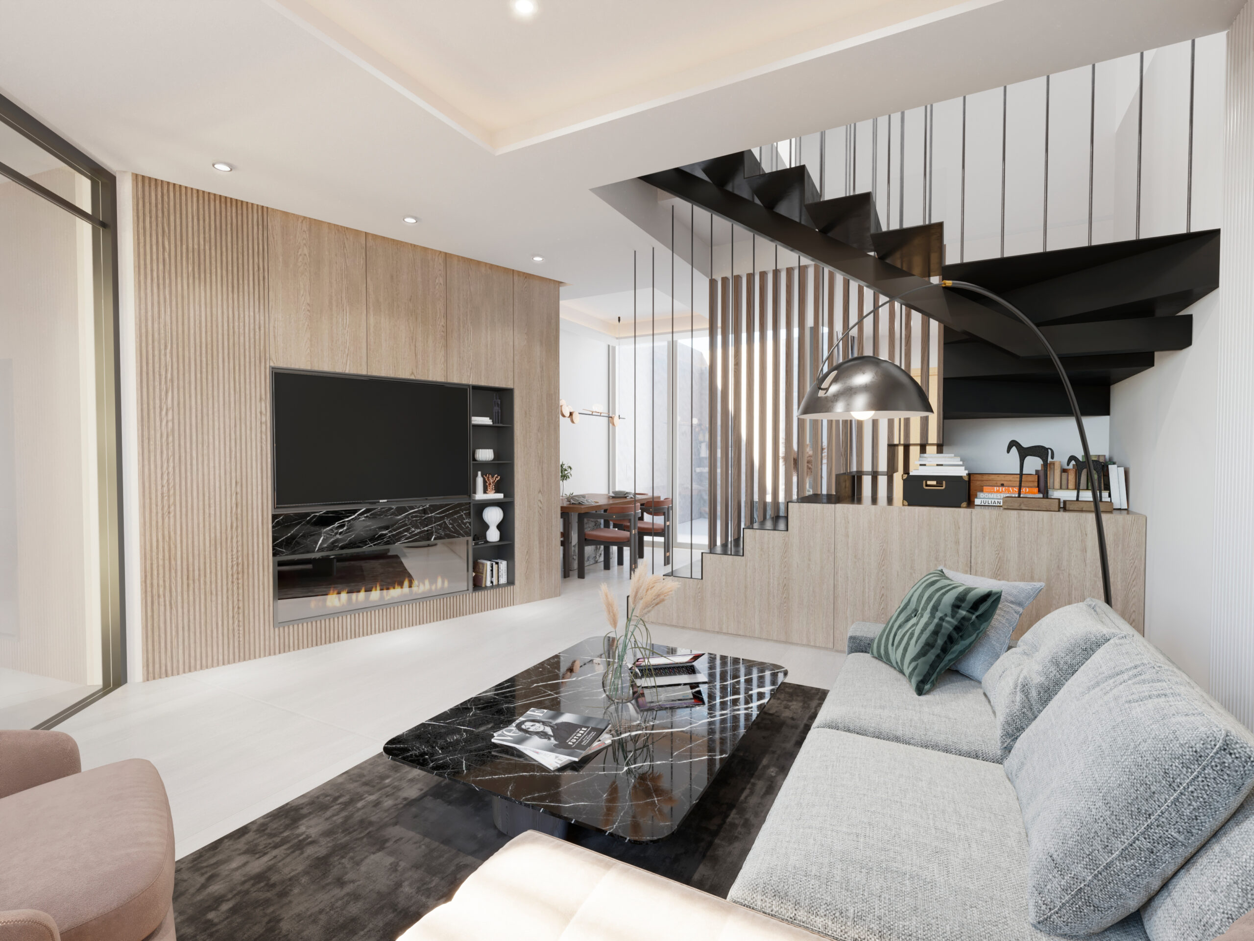 La escalera se concibe como un elemento escultórico, articulando visualmente los dos espacios principales de la planta baja y convirtiéndose en un punto focal del diseño interior.