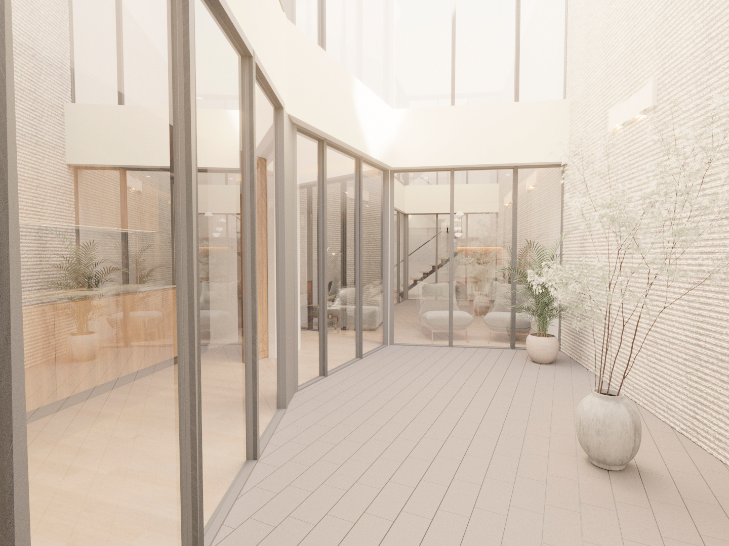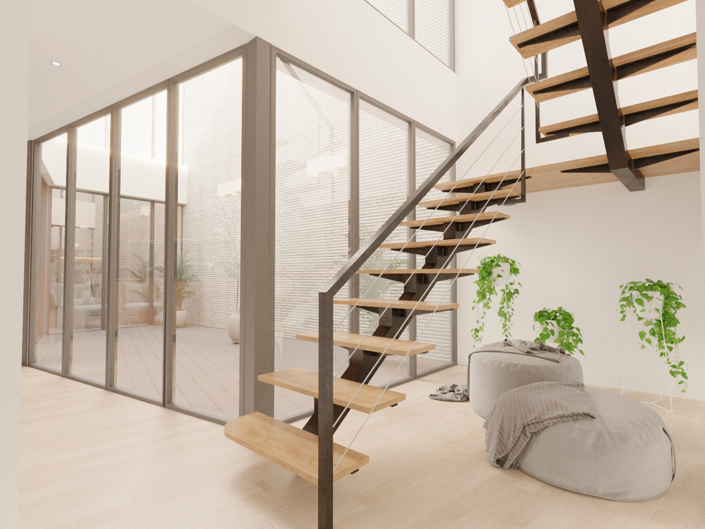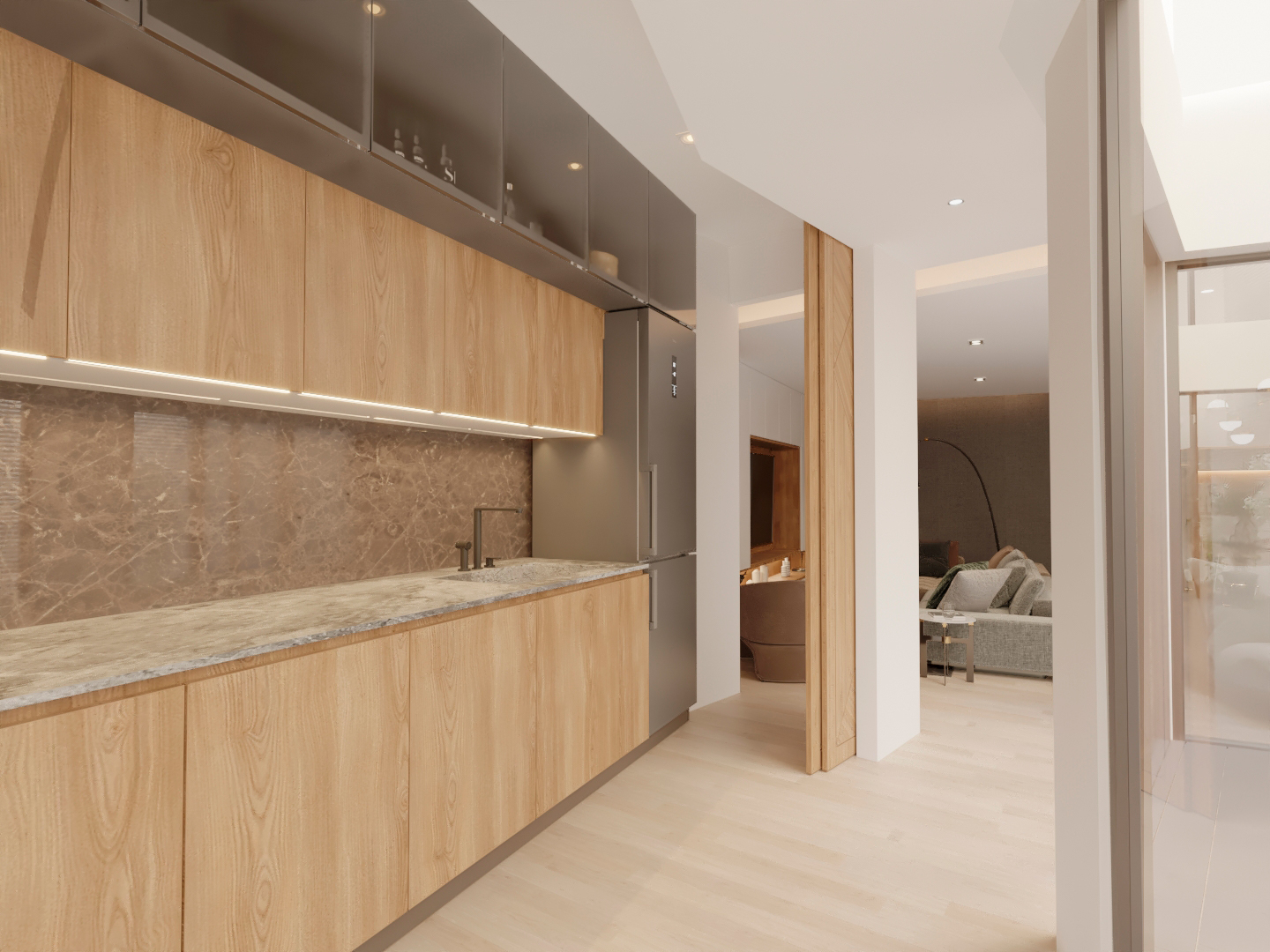Para preservar la importancia del patio, característico de la arquitectura vernácula, se reorganizan los espacios en torno a él. En esta nueva distribución, la cocina se sitúa estratégicamente entre el vestíbulo de la escalera y el salón, permitiendo que, cuando se desee, el patio permanezca cerrado y funcione como un espacio exterior independiente. Sin embargo, también puede abrirse completamente, integrándose con la cocina y el resto de estancias, funcionando casi como una extensión del salón.